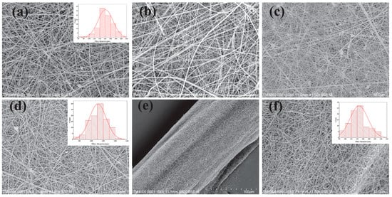 (a) SEM images of HPC/PVP electrospun nanofiber membrane; (b) SEM images of HPC/PVP-0.06% electrospun nanofiber membrane; (c) SEM images of HPC/PVP-0.07% electrospun nanofiber membrane; (d) SEM images of HPC/PVP-0.08% electrospun nanofiber membrane; (e,f) HPC/PVP/Zn electrospun nanofiber membrane and HPC/PVP/Zn electrospun wrapped yarns. Reprinted from ref. [].