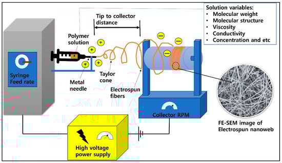 Electrospinning technology can produce nano-thick fibers through high voltage and Van der Waals attraction. This nanotechnology is being actively studied in medical, fiber, and various engineering fields for reasons such as high surface area, possible core–sheath production, etc. A schematic of the electrospinning process is shown in Figure 5.