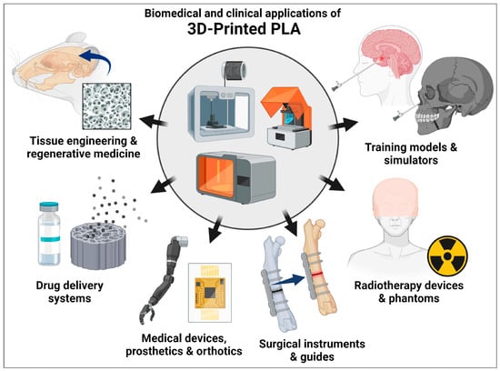 - Barcena, A.J.R.; Ravi, P.; Kundu, S.; Tappa, K. Emerging Biomedical and Clinical Applications of 3D-Printed Poly(Lactic Acid)-Based Devices and Delivery Systems. Bioengineering 2024, 11, 705. [Google Scholar] [CrossRef]