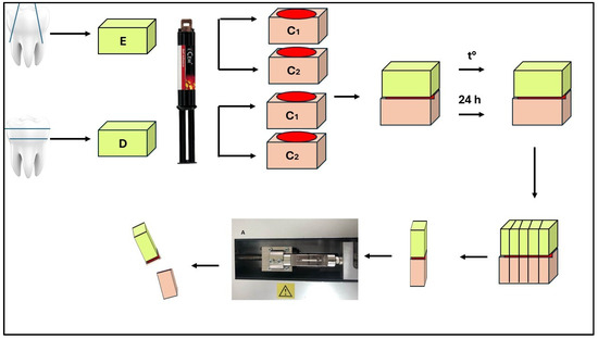 Scheme for preparing enamel and dentin specimens for micro-tensile testing. Legend: E—enamel; D—dentin; C1—composite 1 (Signum ceramis); C2—composite 2 (Cerasmart); and t°—thermocycling.