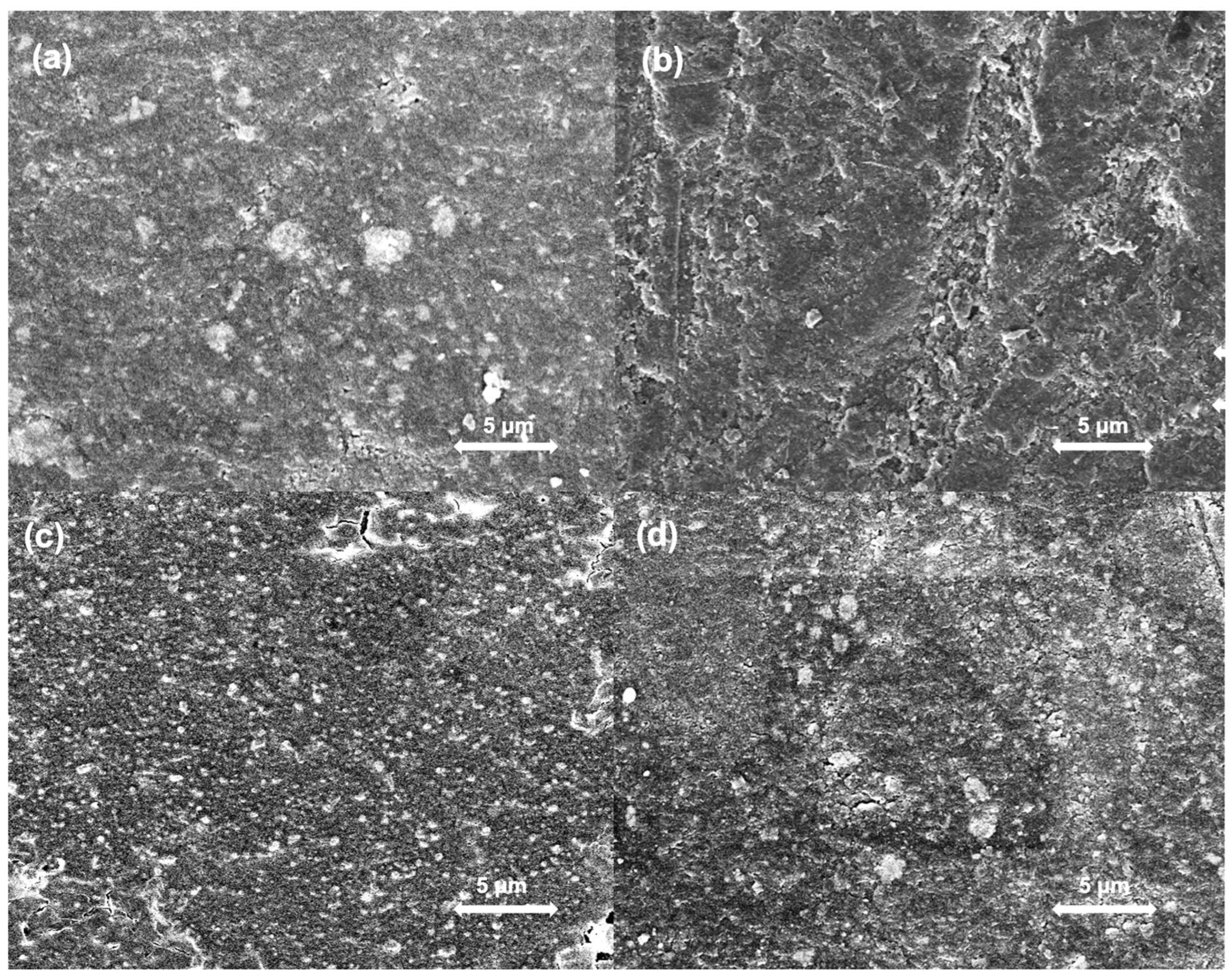 To visualize the microstructure of the specimen surfaces and to evaluate the presence of precipitates, specimens were examined with a scanning electron microscope (SEM) before and after ultrasonic cleaning. Before the images were taken, specimens were dried in a vacuum for one day and then coated with carbon to increase conductivity. Scanning electron micrographs with a magnification of 5000× at 3 kV were taken using the Nova NanoSEM 450 (FEI Company, Hillsboro, OR, USA).