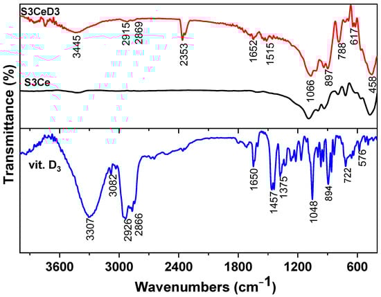 FTIR analysis of vitamin D3, S3Ce and S3CeD3 scaffolds.