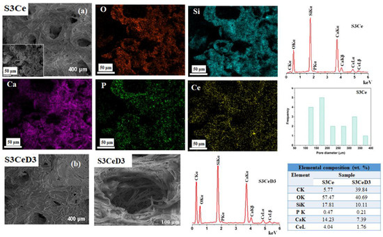 SEM image of the S3Ce scaffold, EDX mapping for O, Si, Ca, P, and Ce, EDX analysis of the S3Ce scaffold surface and pore size distribution of S3Ce scaffold (a); SEM image at different magnifications, EDX analysis of the S3CeD3 scaffold and elemental composition of the investigated scaffolds (b).