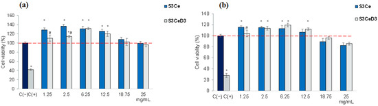 SaOS-2 osteoblast viability assessed by MTT assay in different concentrations of S3Ce and S3CeD3 scaffold extracts after 48 h (a) and 96 h (b) of cultivation. The results were obtained as the mean of three determinations ± SD and presented relative to the control culture (cells cultivated in the absence of the sample), which was considered 100% viable; * p < 0.05, compared to the control. # p < 0.05, compared to S3Ce.