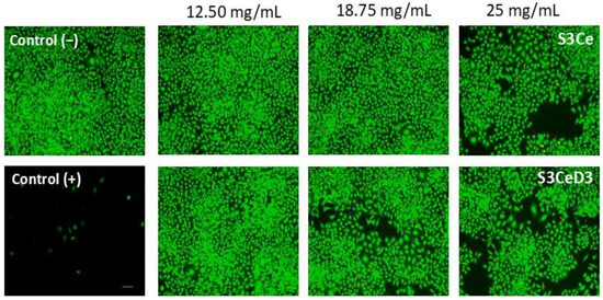 Fluorescence microscopy images indicating the SaOS-2 osteoblast viability after 96 h of cultivation in the presence of S3Ce and S3CeD3 scaffolds obtained using the Live and Dead assay.