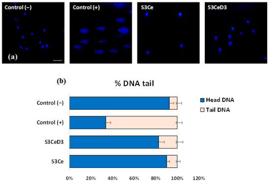 Fluorescence micrographs of DAPI-stained SaOS-2 osteoblasts cultivated in the presence of S3Ce and S3CeD3 scaffolds for 24 h (a) and histogram of the percentage of DNA tail in comet cells determined using Comet Score Pro v.1.5 software (b). The results are presented as the mean ± SD (n = 3). Untreated cells were used as a negative control (C (−)). Cells treated with 100 µM H2O2 were used as a positive control (C (+)). Scale bar = 100 µm.