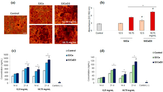 This study on the osteogenic capacity of functionalized scaffolds aimed to provide insights into the mechanisms of biomaterial-mediated bone regeneration in a culture of osteogenic, differentiated DPSCs. Thus, the influence of the S3Ce and S3CeD3 scaffolds on the extracellular matrix mineralization of DPSCs was analyzed after 21 days of incubation. The calcium deposits in treated cultures were qualitatively and quantitatively evaluated using Alizarin Red S staining. In the untreated culture (control), Alizarin Red S staining resulted in partial red coloration of the extracellular matrix of the DPSCs, indicating the presence of small calcium or mineralized deposits. In contrast, the treated culture exhibited an intense red coloration of the extracellular matrix, particularly at 18.75 mg/mL for both non-functionalized and functionalized scaffolds (Figure 6a).