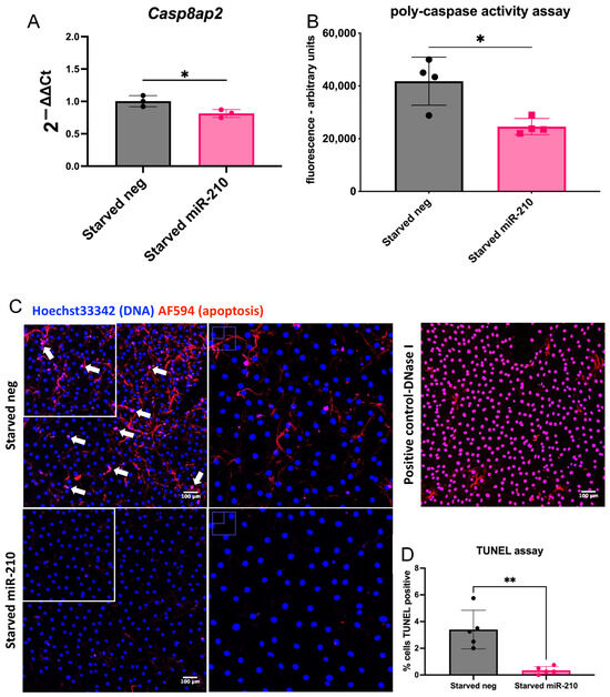 CPCs were isolated from mouse atria, expanded to passage 7, and then transfected with miR-210 or a negative-miRNA. miR-210 overexpression was confirmed 48 and 72 h after transfection using qRT-PCR (Figure S1). To validate miR-210’s pro-survival effect and confirm that it targets cell death pathways in CPCs, the expression of its known direct target, Casp8ap2 [23], was analysed after miRNA transfection and 72 h of serum starvation. Casp8ap2 expression was significantly reduced following miR-210 transfection in comparison to the negative miRNA (Figure 1A). A poly-caspase activity assay revealed significantly reduced overall activity of caspases following miR-210 transfection in comparison to the negative miRNA (Figure 1B). Finally, reduced apoptotic cell death was confirmed by measuring DNA fragmentation using a TUNEL assay (Figure 1C,D).