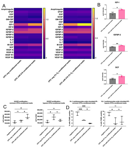 miR-210 enhances the paracrine potential of CPCs as shown by increased HUVEC proliferation and an anti-apoptotic effect in HL-1 cardiomyocytes during indirect co-culture. (A) The secretion of 20 growth factors was assessed using an array in the conditioned media of miR-210-transfected CPCs, in comparison to CPCs transfected with a negative miRNA, after 48 h culture under normoxia or hypoxia. Spot intensity of the samples was normalised to the average of the positive control spots of each array. The heatmap illustrates spot intensity (black is low or absent; yellow is high) of the assessed factors secreted from CPCs cultured in normoxia or hypoxia. (B) Individual representation of growth factors with significantly increased secretion in miR-210-transfected CPCs cultured under normoxia compared with controls. Analysed using a t-test (n = 3; * p < 0.05, ** p < 0.01). (C) HUVEC proliferation in 1:1 serum-free HUVEC media and (D) TUNEL+ cells in HL-1 cardiomyocytes after 24 h culture with conditioned media of miR-210-transfected CPCs or of negative miRNA-transfected CPCs, with unconditioned media as a negative control, where the conditioned media were from CPCs that had been cultured under hypoxia or normoxia for 48 h. Analysed using a one-way ANOVA with Tukey’s multiple comparisons test (n = 3; ns = not statistically significant, * p < 0.05, ** p < 0.01, *** p < 0.001).