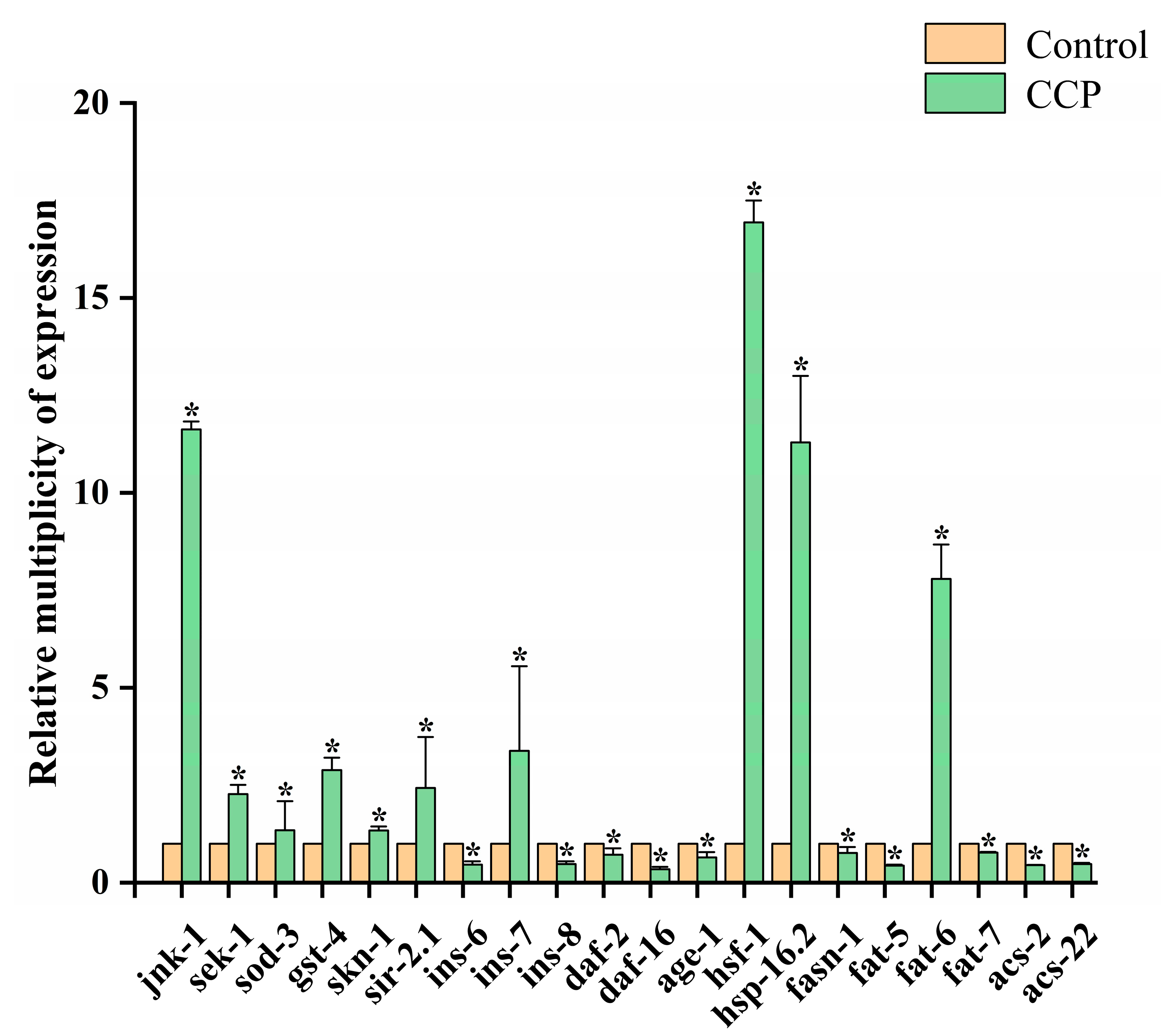 3.7. Effect of CCPs on Gene Expression of C. elegans