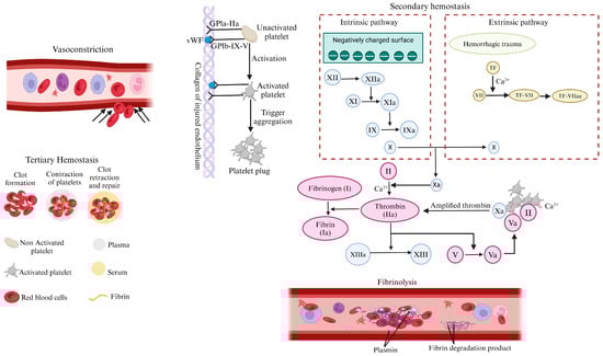Hemostasis is a multi-step process that stops bleeding and facilitates wound repair by forming a hemostatic plug to seal the injured vessel [] (Figure 1). The initial step begins with vasoconstriction, which occurs immediately after vascular injury; blood vessels constrict to reduce blood flow and minimize blood loss []. This is followed by the next step, known as primary hemostasis, which involves platelets adhering to exposed collagen at the injury site becoming activated and aggregating, forming a temporary platelet plug. This plug provides an initial seal and initiates the clotting process []. The receptors’ interactions, such as GPIa-IIa and GPIb-IX-V, facilitate platelet activation and aggregation []. Subsequently, the coagulation cascade is also known as secondary hemostasis []. This stage involves a complex sequence of clotting factors that convert fibrinogen into fibrin threads, which weave through the platelet plug, stabilizing it into a firm clot []. This process includes both extrinsic and intrinsic pathways and reinforces vascular integrity []. This is then followed by clot retraction, also known as tertiary hemostasis []. This process promotes platelet contraction, fibroblast incorporation, and pulling wound edges together, or wound edge approximation, aiding in tissue repair and forming a stable, cohesive clot []. Finally, fibrinolysis occurs. Once the vessel has healed sufficiently, plasmin degrades the fibrin into soluble fragments, effectively dissolving the clot to restore normal blood flow and prevent unwanted clotting [].