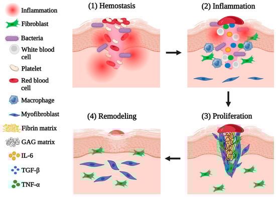 Similarly, wound healing involves four distinct phases that work collectively to repair tissue damage and restore skin integrity [] (Figure 2). Hemostasis is the initial stage that stops bleeding by forming a clot at the wound site, which also serves as a matrix for subsequent phases of healing []. The inflammation phase follows, which is the second stage and is marked by the influx of immune cells, primarily neutrophils and macrophages, that arrive to eliminate bacteria, clear debris, and prevent infection []. This stage is marked by the release of cytokines, including IL-6 and TNF-alpha, which attract inflammatory cells to the site []. Then follows the tertiary stage, the proliferation phase, which involves the formation of new tissue by fibroblasts, endothelial cells, and keratinocytes []. Fibroblasts produce collagen, endothelial cells promote angiogenesis, and keratinocytes facilitate re-epithelialization. TGF-beta plays a critical role in activating fibroblasts and promoting tissue reconstruction []. The last stage, remodeling, follows: During this phase, type III collagen is replaced by type I collagen to increase tissue strength, with fibroblasts secreting enzymes to organize the collagen matrix []. Myofibroblasts contribute to wound contraction, while unnecessary cells are eliminated by apoptosis. This phase leads to mature and strengthened scar tissue [].