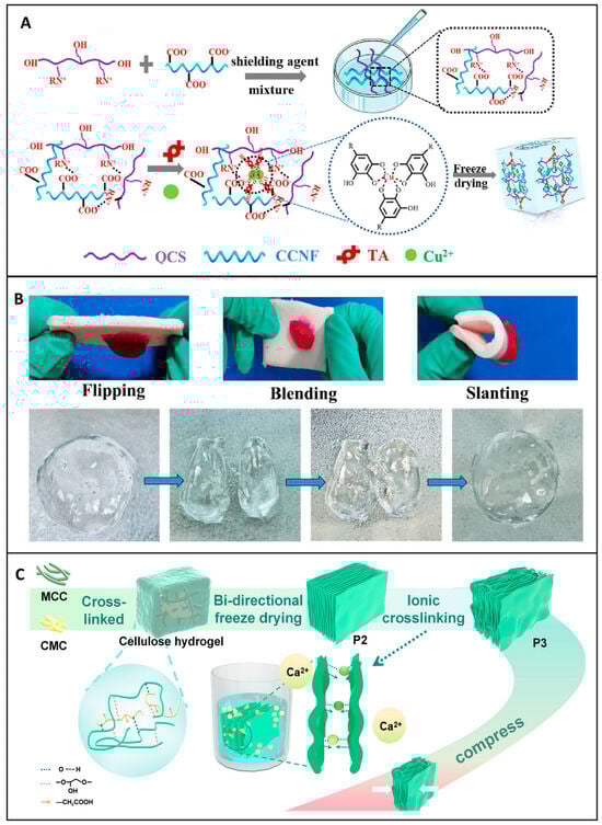 The integration of bioactive coatings has emerged as a crucial strategy to enhance the wound care capabilities of cellulose dressings. These coatings confer additional functionalities that are highly beneficial in promoting effective wound healing. Coatings containing tannic acid and Fe3+ ions or silver nanoparticles have been shown to significantly augment performance. The Fe3+-coated cellulose sponge, as investigated by Zhang et al., demonstrated rapid coagulation and potent bacteriostatic effects in animal models []. This is in contrast to uncoated cellulose dressings, which may lack such rapid hemostatic and antimicrobial properties. The addition of silver nanoparticles is a well-known approach to impact antimicrobial activity, and, when combined with cellulose, it provides an added layer of protection against wound infections []. Similarly, the incorporation of copper nanoparticles, as shown by Cheng et al., offers antimicrobial benefits while maintaining biocompatibility, as seen in Figure 5C. Their design of a microchannel structure based on nanofibrillated cellulose and quaterinated chitosan (QCS) and CCNF using tannic acid and a Cu2+ complex not only showed excellent fluid absorption and hemostasis capability but also highlights the potential of this particular coating strategy compared to other methods that may not achieve such a balance between functionality and biocompatibility [].