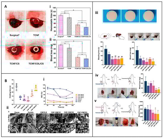 As an exemplary hemostatic material, cellulose-based composites present a host of remarkable attributes that render them highly suitable for a wide range of clinical requirements []. Their ease of manipulation, rapid clot-forming potential, and excellent biocompatibility set them apart, carving out a promising niche in hemostasis and wound healing applications. This is underpinned by their customizable chemical, mechanical, and biological characteristics, as depicted in Figure 3 [,].