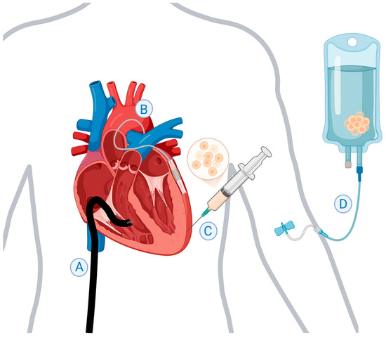 Key methods of stem cell delivery. (A) Transendocardial intramyocardial injection performed via cannulation of the femoral vein. (B) Intracoronary administration during percutaneous coronary intervention using the stop-flow technique. (C) Transepicardial intramyocardial injection performed via sternotomy or lateral thoracotomy. (D) Intravenous infusion through a peripheral vein. This figure was created in http://BioRender.com (accessed on 14 April 2025).