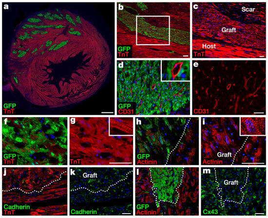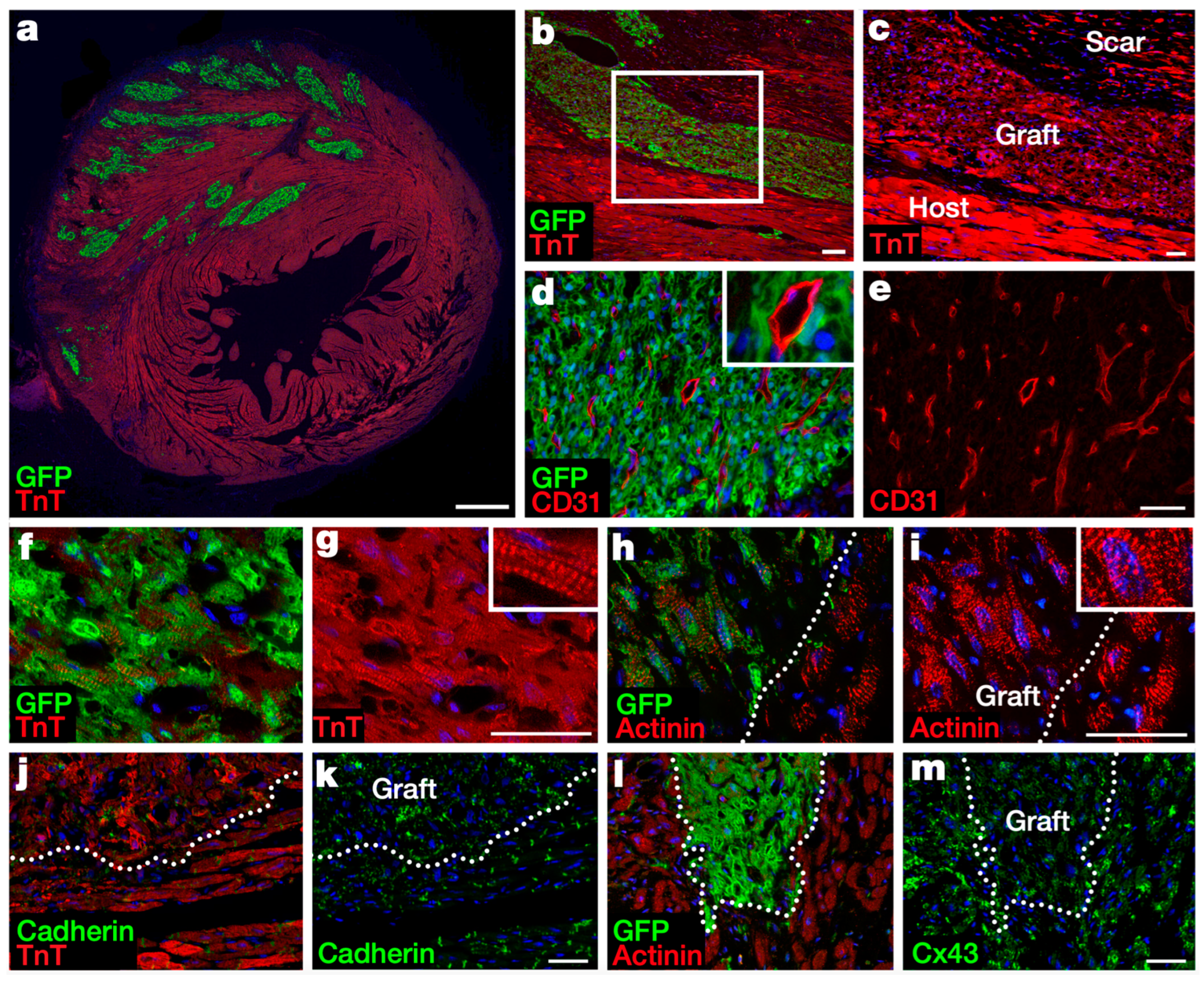 Transplanted iPSC-CMs partially remuscularize infarcted cynomolgus monkey hearts when injected into the myocardium. Grafts were studied on day 84 post-transplantation. (a) Grafted GFP+ iPSC-CMs (green) survived in the anterior left ventricle. (b,c) Grafted GFP+ iPSC-CMs expressed cardiac troponin T (TnT). (d,e) Graft cardiomyocytes were well vascularized by host-derived endothelial (GFP−/CD31+) cells. (f–i) Graft cardiomyocytes showed sarcomeric structures identified by TnT and ⍺-actinin staining. (j–m) Cell adhesion and gap junction proteins, cadherin, and connexin 43 (Cx43) were expressed by graft and host cells. Dashed lines indicate the border between graft and host tissues. Nuclei are stained blue. This figure was reprinted with permission from reference [93] copyright 2016 Springer Nature.