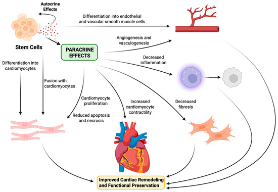 Stem cell mechanisms of cardiac regeneration and repair. This figure was created in http://BioRender.com (accessed on 14 April 2025).
