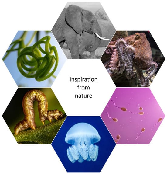 Soft machines are robotic systems primarily composed of compliant, deformable materials that enable them to safely adapt to unstructured environments and interact safely with humans and biological tissue. Soft machines stand at the forefront of technological innovation, aiming to replicate the remarkable capabilities of biological systems in artificial machines. By mimicking the flexibility and adaptability observed in nature, soft machines have the potential to revolutionize various industries and applications [1]. Bioinspired materials play a key role in this field, offering unique properties that enable robots to interact safely and effectively with their environment. The significance of bioinspired materials in soft machines lies in their ability to infuse robots with characteristics parallel to living organisms [2]. These materials are carefully selected to mimic the mechanical properties of biological tissues, allowing for soft machines to move with agility, conform to different surfaces, and interact delicately with objects and living beings [3,4]. Through bioinspired design principles, researchers aim to create robots that can navigate complex environments with ease and perform tasks that were once reserved for living creatures [5]. The three most important characteristics of soft machines are their flexibility, adaptability, and resilience in their motion, enabling them to navigate complex environments, interact safely with humans, and perform delicate tasks with precision [6], inspired by different scale body parts in the animal kingdom such as those shown in Figure 1 [7].