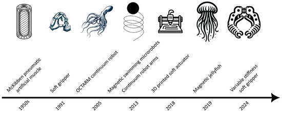 Nature has long served as a source of inspiration for human innovation, and in the realm of soft machines, the study of biological systems has proven particularly fruitful. One of the most captivating aspects of biology is how animals exploit soft structures to navigate their environments with remarkable proficiency and adaptability [8]. Understanding these biological inspirations not only sheds light on the fine details of natural systems but also provides valuable insights for the design and development of soft robotic technologies [9]. As shown in Figure 2, the timeline for bioinspired soft machines encompasses the evolution of soft machines from inception, highlighting key milestones where interdisciplinary efforts in biology, materials science, and engineering have converged to shape the field [10]. Through exploration of nature’s elegant solutions and ongoing advancements in bioinspired materials, the narrative traces the trajectory towards designing robots that mimic the adaptability and versatility found in natural organisms. This timeline underscores the collaborative efforts driving innovation in soft machines, leading to robots integrating into complex environments, having the potential to offer transformative solutions to societal challenges.