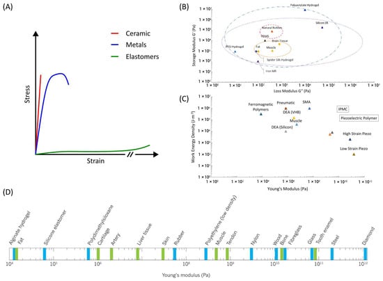 Mechanical characteristics of soft materials in soft machines: (A) Typical stress–strain curve plots depicting the mechanical behavior of various materials commonly used in soft machines, such as silicone elastomers, urethanes, hydrogels, braided fabrics, hydraulic fluids, and gases. Materials like ceramics and metals have an elastic modulus much higher than soft materials like polymers and elastomers. On the other hand, polymers and especially elastomers can withstand much higher strains and deform accordingly, making them more compliant. Composites composed of a combination of any of these materials would have properties somewhere in between. (B) Approximation of storage modulus vs. loss modulus of various organic and inorganic materials. Hydrogels (blue line); biological tissue (yellow line); natural rubber (red line); electrorheological (ER) and magnetorheological (MR) fluid-based polymers (purple line). Materials that have been used in soft machines: triangle; hard materials: diamond. (C) Work energy density vs. Young’s modulus of established soft materials. Initialisms: SMA—shape memory alloy; IPMC—ionic polymer-metal composite; DEA—dielectric elastomer. Reprinted with permission from Ref. [26]. Copyright 2018, Elsevier Ltd. (D) Understanding the Young’s modulus of these soft components is crucial for designing and fabricating soft machines with the desired mechanical properties, including flexibility, resilience, and responsiveness to external stimuli. Soft machines are composed primarily of materials with moduli comparable with those of soft biological materials, which not only makes them compliant, but also leads to compliance matching. Reprinted with permission [18]. Copyright 2015, Springer Nature Limited.
