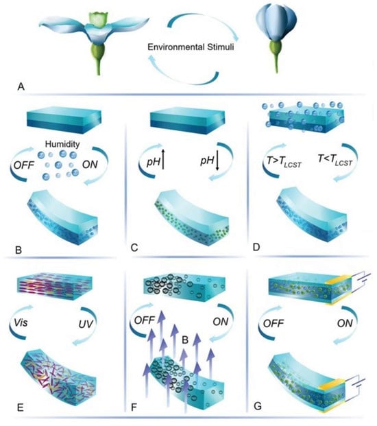 - Thermally responsive actuation employs materials that undergo volumetric or mechanical transitions upon heating, triggered via infrared (IR) or near-infrared (NIR) radiation, thermal conduction, or Joule heating through conductive networks. Examples include hydrogels, thermoplastic elastomers, and liquid crystal elastomers, where thermal input modulates phase behavior, stiffness, or swelling, resulting in controlled morphological transformations [69,70,71] (Figure 5D).