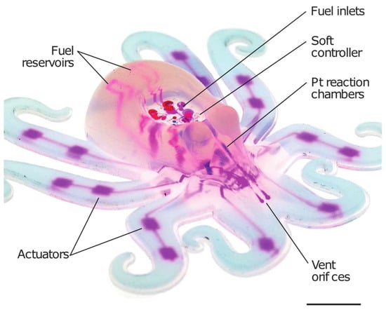 - Bartlett, N.W.; Tolley, M.T.; Overvelde, J.T.B.; Weaver, J.C.; Mosadegh, B.; Bertoldi, K.; Whitesides, G.M.; Wood, R.J. A 3D-printed, functionally graded soft robot powered by combustion. Science 2015, 349, 161–165. [Google Scholar] [CrossRef]