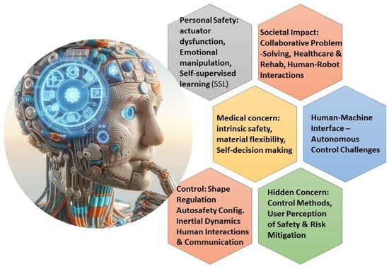 As bioinspired soft machines continue to evolve, it is essential to address ethical considerations and societal impacts associated with their development and deployment. Ethical considerations include issues such as privacy, autonomy, and safety, particularly in applications involving human–robot interaction and healthcare, as shown in Figure 9 [125]. Ensuring transparency and accountability in the design, development, and deployment of soft machines is crucial to mitigate potential risks and ensure ethical standards are upheld [126]. Furthermore, addressing societal impacts involves considerations such as job displacement, economic inequality, and access to technology, as the widespread adoption of soft machines may reshape labor markets and social dynamics. Collaborative efforts involving stakeholders from diverse backgrounds will be essential to navigate these ethical and societal challenges and ensure that bioinspired soft machines benefits humanity as a whole [127]. Projects like the Horizon2020 EU initiative focusing on soft actuated heart development highlight the importance of addressing ethical concerns in medical applications [109,128]. Biohybrid systems that combine living cells or tissues with synthetic materials to open up new possibilities for applications in healthcare, environmental monitoring, etc., raise other ethical concerns [129,130]. Another ethical concern could come with the development of soft machines to function as artificial organs, which could offer solutions to millions of people awaiting transplants worldwide [109,131]. The potential for soft machines to contribute to artificial organs is significant given the global shortage of organ donors.