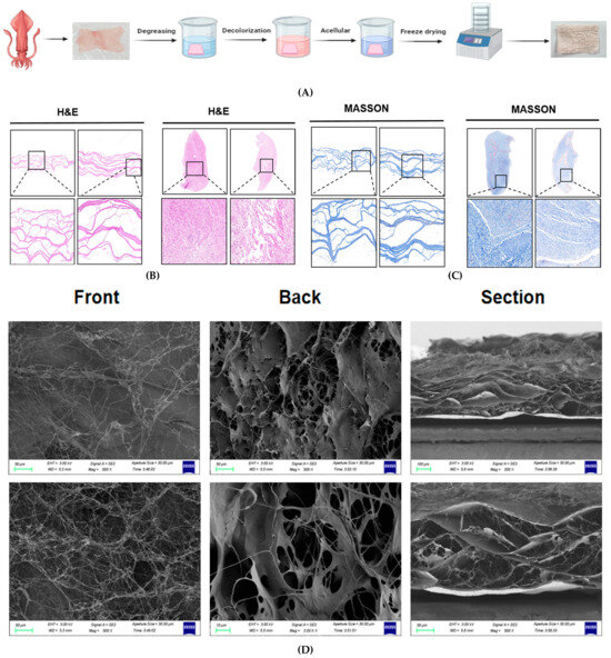 Preparation and characterization of SADM. (A) flow chart of SADM preparation; (B) H&E staining map of squid skin before and after acellular treatment; (C) MASSON staining map of squid skin before and after acellular treatment; (D) SADM scanning electron microscope.