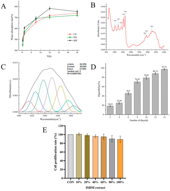 Physical and chemical indicators testing. (A) Solubility of SADM in different solutions (ultrapure water, saline, SPF simulated tissue fluid); (B) SADM’s Fourier transform infrared spectrum (FTIR); (C) The secondary structure of SADM was determined by Gaussian deconvolution analysis of the amide I region; (D) In vitro enzyme digestion rate of SADM; (E) Cell proliferative effects of ISDM extract in MSCs cells.