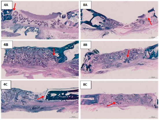 Safranin green staining observation of post-operative animal models. A: Blank Group B: Squid Collagen Membrane C: HEAL-ALL Membrane. The numbers 4 and 8 represent weeks 4 and 8, respectively. Red arrows indicate the presence of new and mature bone trabeculae in the bone defect area.