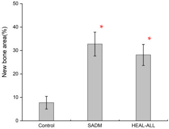 The mean and standard deviations of the new bone area are shown in Table 2 and Figure 6. At 8 weeks, the new bone area (%) of the Control, SADM, and HEAL-ALL groups were 7.73 (±2.71), 32.76 (±5.11), and 28.12 (±4.48), respectively. The HEAL-ALL groups and SADM groups showed significant differences from the Control (p > 0.05).