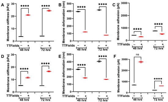 In the AsPC1 + ECM complex, the presence of the ECM significantly increased the cell membrane stiffness and was observed to be at 8.9 ± 0.2 kPa and 13.1 ± 0.2 kPa at 48 h and 72 h, respectively, as seen in Figure 2D and Figure 3D. Under the influence of TTFields, the average membrane stiffness of the AsPC1 + ECM complex significantly increased to 15 ± 0.2 kPa and 22 ± 0.4 kPa at 48 h and 72 h, respectively, as seen in Figure 3D. The deformation of the complex in the absence of TTFields was observed to be 247.3 ± 2 nm and 187.3 ± 2.5 nm at 48 h and 72 h, respectively. When the TTFields were applied, this parameter decreased consistently for 48 h and 72 h and was observed to be 169.6 ± 2.4 nm and 109.3 ± 1.6, respectively, as seen in Figure 3E. Adhesion exhibited contrasting trends at 48 h and 72 h. At 48 h, we observed that the application of TTFields decreased the adhesion from 711.4 ± 7.7 pN (untreated complex) to 221 ± 4.6 pN. On the contrary, 72 h of exposure with TTFields increased the adhesion from 2147 ± 38.6 pN (untreated complex) to 3248.3 ± 56.1 pN as seen in Figure 3F.