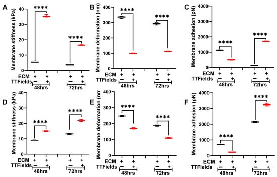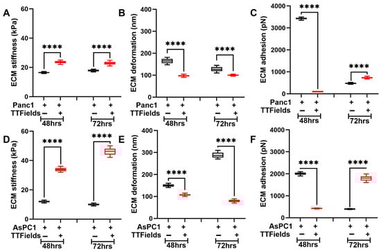 Cells and ECM mutually regulate each other’s nanomechanical properties and regulate TME homeostasis [26]. Herein, we co-cultured Panc1 and AsPC1 cells separately on an ECM comprising collagen, fibronectin, and laminin. For simplicity, we define these co-cultures as Panc1 + ECM or AsPC1 + ECM. We observed that after 48 h, the presence of ECM makes the untreated Panc1 cells stiffer compared to the absence of the ECM as seen in Figure 2A and Figure 3A. The average membrane stiffness of these cells was observed to be 5.4 ± 0.1 kPa. However, at 72 h, we observed that the untreated Panc1 + ECM made the cells softer (3.6 ± 0.1 kPa) compared to the Panc1 in the ECM’s absence as seen in Figure 2A and Figure 3A. This certainly proves that the cell–ECM interactions are complex and dynamic. Upon the application of TTFields, the average membrane stiffness of Panc1 + ECM at 48 h and 72 h was observed to be increased to 35.2 ± 0.4 kPa and 16.5 ± 0.1 kPa, respectively, as seen in Figure 3A. The deformation of Panc1 + ECM was observed to be 333.5 ± 5.1 nm and 292.5 ± 4.5 nm at 48 and 72 h, respectively. However, the TTFields n significantly decreased their deformation at 48 h and 72 h and was observed to be 99.3 ± 1.5 nm and 112.2 ± 1.6 nm, respectively, as seen in Figure 3B. Figure 3C shows the adhesion of the untreated Panc1 + ECM complex to be at 1128.2 ± 10.6 pN and 129.5 ± 3 pN at 48 h and 72 h, respectively, which were observed to exhibit contrasting trends in the presence of TTFields. At 48 h, we observed that the TTFields decreased the adhesion of the complex to 498.7 ± 9.5 pN compared to the absence of TTFields. However, at 72 h we observed a significant increase in Panc1 + ECM adhesion to be at 1707.9 ± 15.8 pN as seen in Figure 3C.