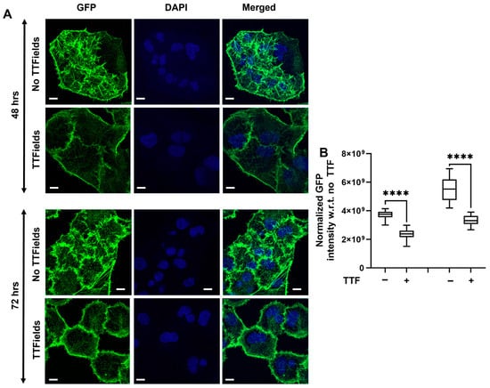 TTFields alter actin organization in Panc1 cells. The TTFields were operated at 150 kHz frequency: (A) Representative confocal images. (B) Quantification of GFP-labeled signal. (n = 12 cells) (Scale bar: 10 μm). Statistical significance was performed using ONE-WAY ANOVA: ****, p < 0.0001.