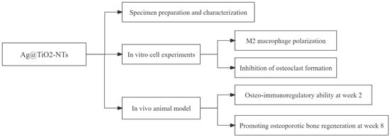 The primary objective of this study was to investigate the immunomodulatory effects of Ag@TiO2-NTs on RANKL-induced osteoclastogenesis and macrophage polarization in vitro. By understanding how Ag@TiO2-NTs influences these cellular processes, we aimed to shed light on its mechanisms of action at the cellular level. Additionally, we sought to evaluate the impact of Ag@TiO2-NTs on the regeneration of osteoporotic bone defects in ovariectomized (OVX) rats, which is a well-established model for postmenopausal osteoporosis. Our findings may provide valuable insights into the therapeutic potential of Ag@TiO2-NTs for treating osteoporotic bone defects, offering a novel approach to stimulating bone regeneration through immune modulation and controlled silver ion release.