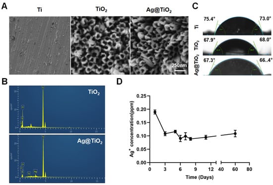 The surface morphology of the samples (Ti, TiO2-NTs, and Ag@TiO2-NTs) was examined using scanning electron microscopy (SEM, FEI Nova400 Nano, Waltham, MA, USA). Energy-dispersive X-ray spectroscopy (EDS; Tecnai G20, FEI, Waltham, MA, USA) was used to analyze the chemical composition. The hydrophilicity of the samples was measured using a contact angle goniometer (DSA1, Kruss, Hamburg, Germany).