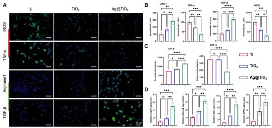The LPS-treated macrophages were seeded onto Ti, TiO2-NTs, and Ag@TiO2-NT surfaces, and after two days of culture, the expression of M1 (iNOS and TNF-α) and M2 (Arginase1 and TGF-β) markers was analyzed via immunofluorescence staining and ELISA. As shown in Figure 3A,B, compared to Ti and TiO2-NTs, the fluorescence signal of iNOS and TGF-α in the Ag@TiO2-NTs group was much lower, while Arginase1 and TGF-β followed an opposite trend. Furthermore, the ELISA of TGF-α and TGF-β showed a similar trend (Figure 3C). We used a traditional co-culture method with macrophage-conditioned medium (CM) to treat MC3T3-E1 to investigate the effects of Ag@TiO2-NTs on osteogenic gene expression in MC3T3-E1 cells. The results showed that the CM from the Ag@TiO2-NTs group significantly promoted the expression of osteogenic genes ALP, Runx2, OCN, and OPN (Figure 3D).