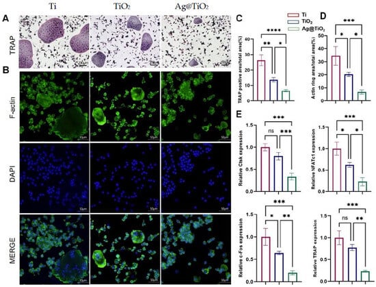 To evaluate osteoclast differentiation, tartrate-resistant acid phosphatase (TRAP), a well-known marker for osteoclasts, staining was performed, and F-actin immunofluorescence staining was used to reveal mature osteoclast formation. The TRAP activity and F-actin formation of BMMs under RANKL and m-CSF induction were evaluated to assess the level of osteoclast differentiation. The inhibitory effects of Ti, TiO2-NTs, and Ag@TiO2-NTs on RANKL-induced osteoclast differentiation was assessed using TRAP and F-actin immunofluorescence staining (Figure 4A,B). Quantitative analysis revealed that Ag@TiO2-NTs significantly inhibited osteoclast differentiation and maturation compared to Ti and TiO2-NTs groups (Figure 4C,D). qRT-PCR analysis identified the downregulated expression of osteoclast-specific genes such as Ctsk, NFATc1, c-Fos, and TRAP in the Ag@TiO2-NTs group upon RANKL induction (Figure 4E).