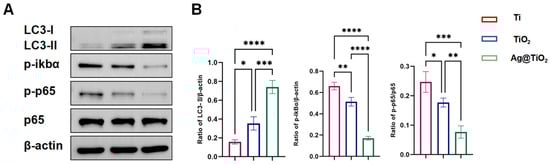 Autophagy serves as a fundamental cellular mechanism for maintaining homeostasis and regulating immune responses, partly by mitigating oxidative stress through the removal of reactive oxygen species (ROS). To investigate autophagy activity, the expression levels of key markers in RANKL-stimulated RAW 264.7 cells were assessed via Western blot analysis, focusing on LC3, a core protein associated with autophagosome formation. Quantitative analysis revealed that Ag@TiO2-NTs significantly enhanced autophagy in RANKL-induced RAW 264.7 cells compared to the Ti and TiO2-NTs groups (Figure 5A,B). The NF-κB signaling pathway is a classic pathway involved in osteoclast activation. Western blot analysis was performed to assess the inhibition of the NF-κB pathway in RANKL-induced osteoclasts. Quantitative analysis revealed that Ag@TiO2-NTs had a significantly stronger inhibitory effect on the NF-κB signaling pathway in RANKL-induced osteoclasts compared to the Ti and TiO2-NTs groups (Figure 5A,B). In summary, Ag@TiO2-NTs inhibited RANKL-induced osteoclastogenesis by enhancing autophagy and suppressing the NF-κB pathway.