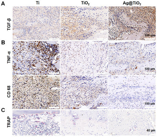 Ag@TiO2-NTs implant created an osteo-immune microenvironment in OVX rats. (A) Representative immunohistochemical staining of TGF-β in different groups after 2 weeks, illustrating the expression of this key cytokine involved in osteogenesis and inflammation. (B) Representative immunohistochemical staining of TNF-α and CD68 in different groups after 2 weeks, showing the inflammatory response and macrophage activity in the treated groups. (C) Representative images of TRAP staining in different groups after 2 weeks, highlighting the osteoclast differentiation and activity in response to the treatments.