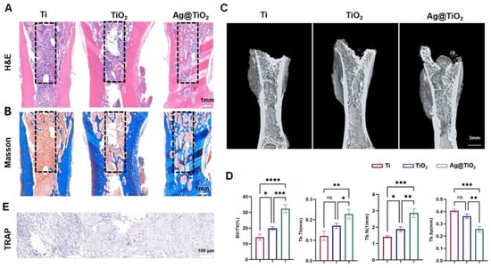 At 8 weeks post iliac bone defect induction, H&E and Masson staining indicated a small amount of new bone tissue in the defect of the Ti implant group (Figure 7A,B). The TiO2-NTs implant group showed a moderate amount of new bone tissue around the defect area, while large empty spaces still remained in the defect area. In contrast, the Ag@TiO2-NTs implant group exhibited uniformly distributed new bone tissue throughout the defect. Additionally, 3D images at week 8 showed more new regenerating bone in the Ag@TiO2-NTs implant group compared to the Ti and TiO2-NTs implant groups (Figure 7C). The percent bone volume (BV/TV)), trabecular thickness (Tb.Th), and trabecular number (Tb.N) in the Ag@TiO2-NTs implant group were significantly higher, and the trabecular separation (Tb.Sp) was significantly lower compared to the Ti and TiO2-NTs implant groups (Figure 7D). Moreover, the decrease in TRAP indicated that osteoclastogenesis around the Ag@TiO2-NTs implants was suppressed (Figure 7E).