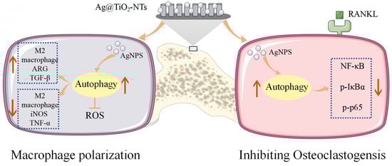 Illustration of Ag@TiO2-NTs’ modulatory role in macrophage polarization and inhibiting osteoclastogensis.