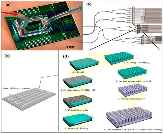 (a) Image of silicon nanowire device array chip. Integrated with a microfluidic technology system, the fluid is deposited into the acrylic acid well through the inlet pipe on the left (red arrow) and discharged from the outlet pipe on the right (blue arrow) to achieve fluid exchange (reprinted from Ref. [], Copyright 2013, American Chemical Society). (b) A schematic diagram of waveguides and microcantilever array layout on the die (reprinted from Ref. [], Copyright 2013, American Chemical Society). (c) An exemplified coral chip with 5 microfluidic chambers (reprinted from Ref. []). (d) Manufacturing process diagram and specific steps of the coral chip chamber surface (reprinted from Ref. []).