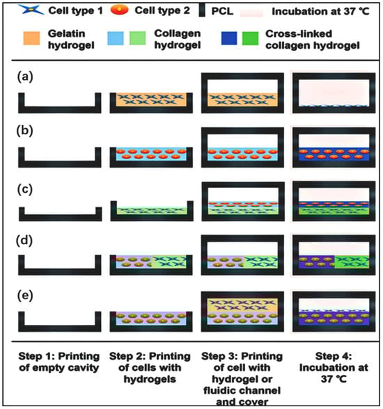 The 3D bioprinting process of organ-on-a-chip platforms for various models. In order, they are (a) 2D model, (b) 3D model, (c) 3D vertical model, (d) 3D horizontal model, and (e) 3D/2D model (reprinted from Ref. []).