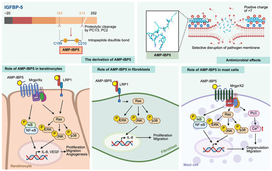 AMP-IBP5 and its role in wound healing. AMP-IBP5 is generated from IGFBP-5 through proteolytic cleavage by the prohormone convertases PC1/3 and PC2, resulting in an amphipathic peptide with a net positive charge at neutral pH and two cysteine residues that form an intramolecular disulfide bond. This unique structure of AMP-IBP5 enables selective interaction with negatively charged microbial membranes, conferring broad-spectrum antimicrobial activity while sparing host cells. Beyond its antimicrobial effects, AMP-IBP5 plays a pivotal role in wound repair by modulating various cellular and immunological processes. In keratinocytes, AMP-IBP5 promotes keratinocyte proliferation and migration through the activation of MrgprX2 and interaction with LRP1, which stimulates IL-8 production and VEGF expression, thereby enhancing re-epithelialization and angiogenesis. In fibroblasts, AMP-IBP5 engages with LRP1 to increase cellular migration and proliferation. Additionally, AMP-IBP5 modulates local immune responses by inducing mast cell degranulation and migration through MrgprX2 signaling, leading to the release of proangiogenic mediators that further contribute to tissue regeneration. Created with BioRender.com https://BioRender.com/ (accessed on 19 February 2025).