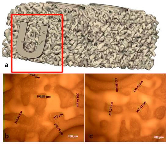 (a) Uniform trabecular bone density design of the scaffold (Mark the “U” mark). Sintered scaffold material after de-binding (b) top view, (c) bottom view.