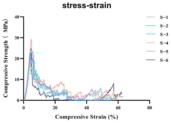 Compressive stress-strain curves of six parallel specimens (labeled S−1 to S−6) under uniaxial compression.Mean compressive strength: 24.77158; standard deviation: 2.359387; coefficient of variation: 9.5246%. (Colored lines represent individual replicates tested at a strain rate of 0.5 mm/min).