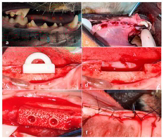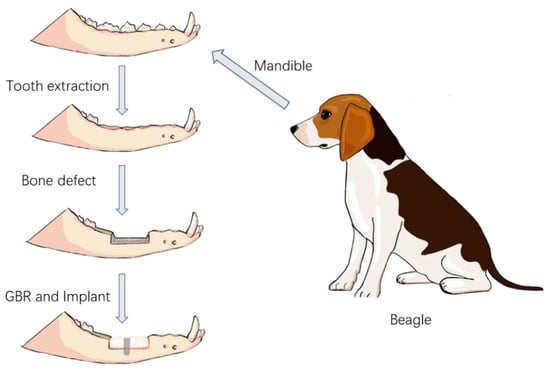 Throughout the surgical procedure, heart rate, oxygen saturation, and body temperature were continuously monitored. Additionally, prior to any surgical manipulation of the mandibular alveolar ridge on each side, local infiltration anesthesia was performed using lidocaine. Postoperatively, all of the experimental dogs received intramuscular injections of Baytril (Bayer AG, Leverkusen, Germany) at a dose of 0.1 mL/kg, along with Puyikang injectable cefquinome sulfate (Henan Zhongsheng Animal Pharmaceutical Co., Ltd., Zhengzhou, China) at a dose of 10 mg/kg, for a total of five days, to prevent inflammation.