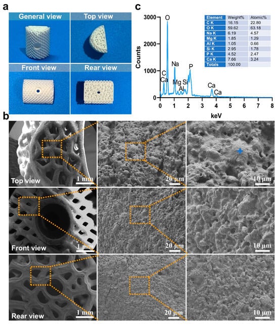 The slurry was then processed using a 3D printer employing DLP technology (Technology and Engineering Center for Space Utilization, Chinese Academy of Sciences, Beijing, China). The printing process was conducted based on STL files, with an exposure time of 3 s, a layer thickness of 30 μm, and a light wavelength of 405 nm. Upon completion of the curing, the scaffold was carefully removed from the curing platform and subjected to ultrasonic cleaning in distilled water for 20 min to eliminate any uncured slurry remaining on the model surface. The scaffolds were sintered according to the following temperature profile: initially, the temperature was increased at a rate of 2 °C/min until reaching 600 °C, where it was maintained for 120 min. Subsequently, the temperature was further increased at a rate of 1 °C/min until reaching 1100 °C, where it was held for another 120 min before being allowed to cool naturally to room temperature. This process resulted in the formation of sintered bioactive glass scaffolds, with a post-sintering shrinkage rate of approximately 22%. Microscopic observation and measurement of the sintered scaffolds revealed a printing accuracy of approximately 300 μm, with a maximum precision of up to 190 μm. The specific morphology of the scaffolds is presented in Figure 1b.