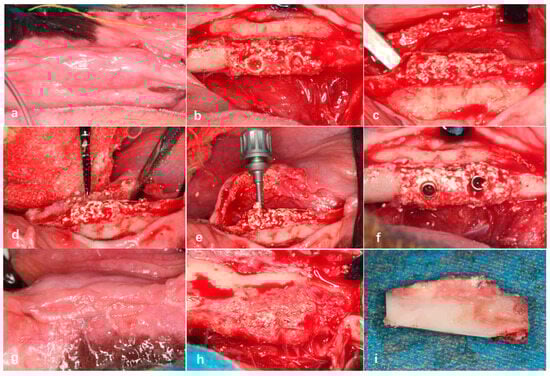 The mucosal healing of the gingiva was favorable in the non-exposed group (a). After gingival flap reflection, the bioactive glass scaffold was well integrated with the alveolar bone defect area, with new bone formation visible inside the scaffold (b) and at the junction with the defect area (c). Preparation of implant osteotomies in the bioactive glass scaffolds (d), placement of two dental implants (e,f). Twelve weeks after implant placement, gingival mucosal healing was favorable (g), and the implant showed “bone healing” with new bone coverage on the surface (h,i).